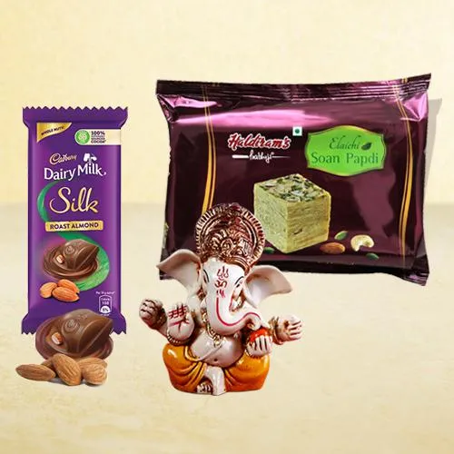 Have a Joyful Diwali with Sweetness of Mithai, Chocolates N Ganesh Idol to deliver happiness into the lives of the people you love. This Deepavali gift contains Polyresin Ganesh Idol, Haldiram Soan Papdi (200 gm) n Cadbury Dairy Milk Silk Roast Almond Chocolate Bar (58 g).