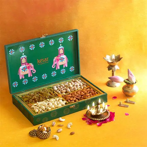 Inside this beautiful box, youll find an indulgent blend of Cashews, Almonds, Pistachios, and Raisins, each weighing 150 grams. These premium nuts and dried fruit have been carefully selected to ensure a delectable and satisfying snacking experience. Whether youre hosting a Diwali gathering or looking for a fabulous gift for friends and family, the Carnival BoxCashew is sure to impress.